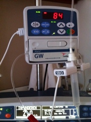 Het infuus is aangesloten. Gelukkig is dat ding mobiel…. In plaats van insuline te prikken wordt het nu via mijn arm toegediend.