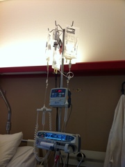Het infuus is aangesloten. Gelukkig is dat ding mobiel…. In plaats van insuline te prikken wordt het nu via mijn arm toegediend.