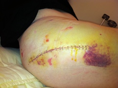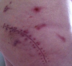 Vandaag gesprek gehad met de fysiotherapeute. Enkele oefeningen doorgenomen waar ik de komende vier weken aan moet werken. De wond geneest goed en de (wond) pijn is elke dag iets minder. De pijn die ik voor de operatie had is nagenoeg verdwenen. Pas over een jaar kunnen we definitief een oordeel velgen.Krammetjes eruit